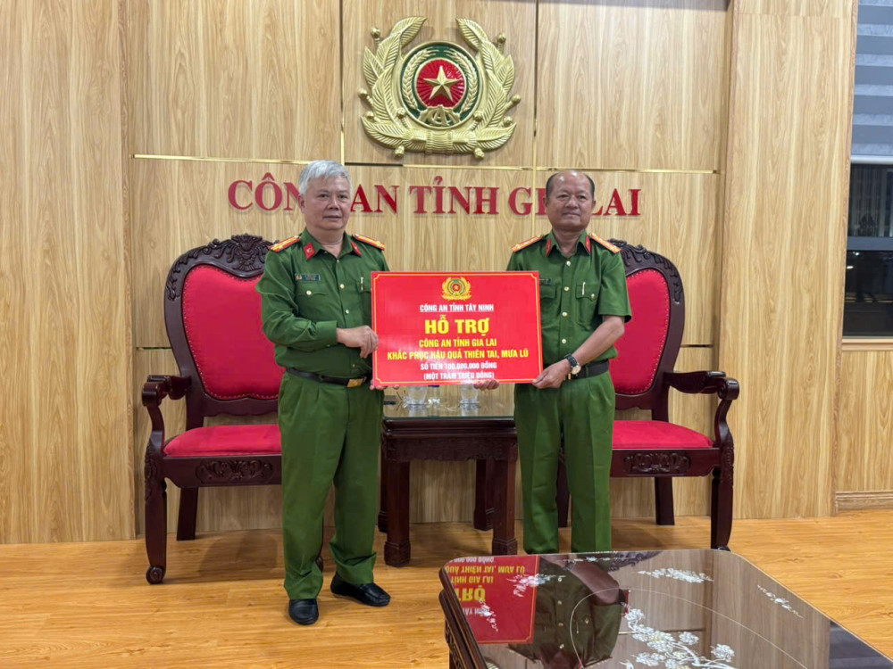 Chiều cùng ngày, thay mặt Ban Giám đốc Công an tỉnh Tây Ninh, Đại tá Trần Văn Luận - Phó Giám đốc Công an tỉnh Tây Ninh, trao số tiền 100 triệu đồng để hỗ trợ công tác khắc phục hậu quả mưa, lũ tại tỉnh Gia Lai.