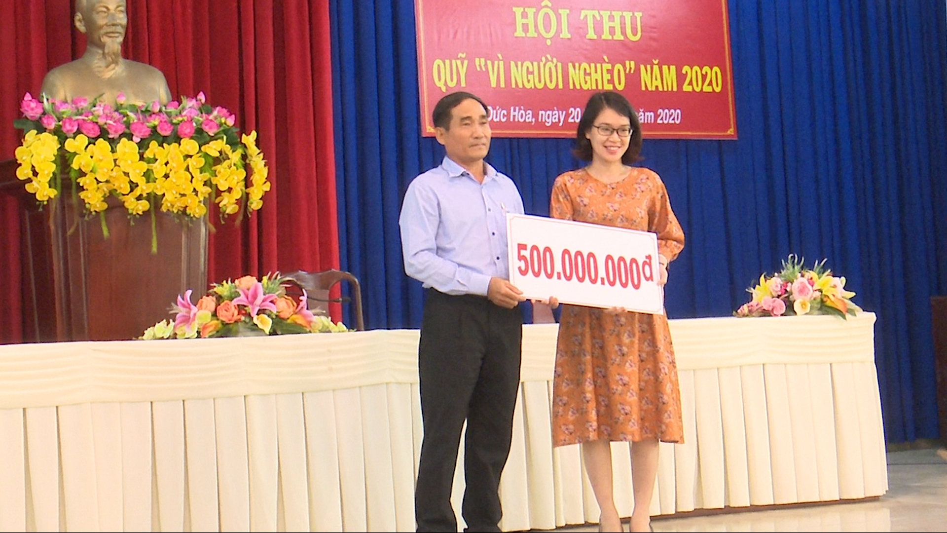 Thời gian qua, Đảng bộ, Chính quyền và nhân dân huyện Đức Hòa tích cực hưởng ứng cuộc vận động “Ngày vì người nghèo” do Ủy ban Trung ương Mặt trận Tổ quốc Việt Nam phát động. Từ nguồn quỹ này, nhiều hộ nghèo, gia đình khó khăn trên địa bàn huyện được chia sẻ và tạo điều kiện phát triển kinh tế hộ gia đình. Riêng năm 2019, huyện Đức Hòa vận động được gần 3,6 tỷ đồng. Từ nguồn quỹ, đã xây dựng 89 nhà đại đoàn kết, nhà tình thương, mái ấm công đoàn, nhà tình bạn.