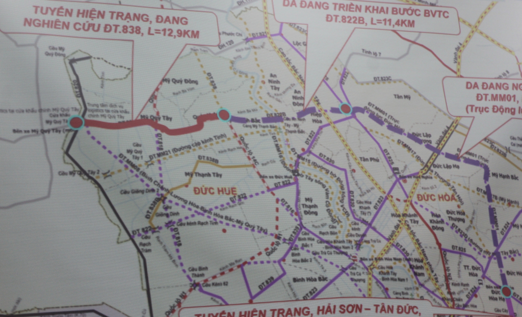 Cả 2 phương án có quy mô hoàn thiện 6 làn xe. Sau khi nghe đơn vị tư vấn đưa ra các phương án, huyện thống nhất với sự chỉ đạo của tỉnh về phương án theo quy hoạch là 33m nhưng với kinh phí đơn vị tư vấn đưa ra rất lớn so với khả năng của huyện. Để tạo sự kết nối giữa các đô thị của huyện, góp phần phát triển kinh tế - xã hội đồng thời bảo đảm an ninh quốc phòng, lãnh đạo huyện Đức Huệ đã đề xuất với Sở GTVT tỉnh nâng cấp tuyến đường 838 từ vòng xoay UBND huyện đến đoạn ấp 6, xã Mỹ Thạnh Đông để kết nối và đồng bộ với tuyến đường tỉnh 822B. Đồng thời, đề xuất Sở GTVT tỉnh xem xét kiến nghị với UBND tỉnh hỗ trợ chi phí này cho huyện vì quá lớn so với nguồn thu của huyện.